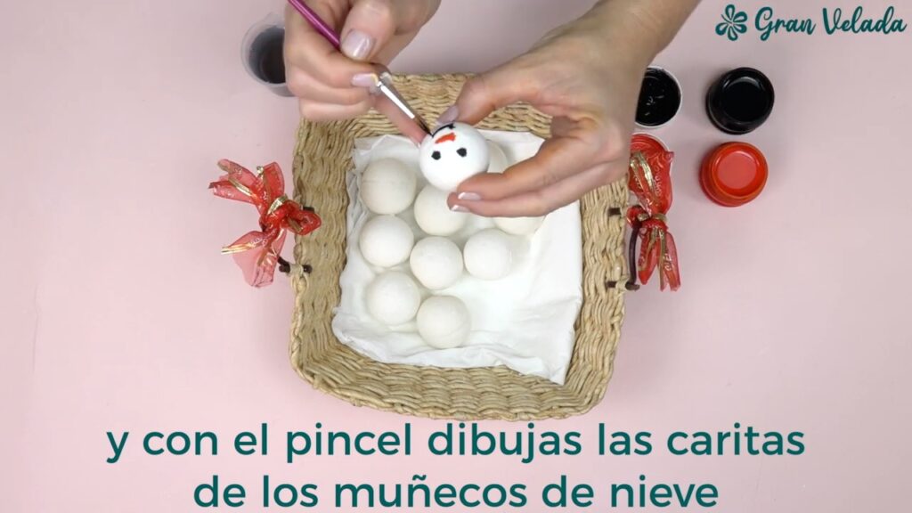Para decorarlas se necesita pinturas para jabón y un pincel de punta fina. Hay que agitar bien la pintura y con el pincel dibujas las caritas de los muñecos de nieve.