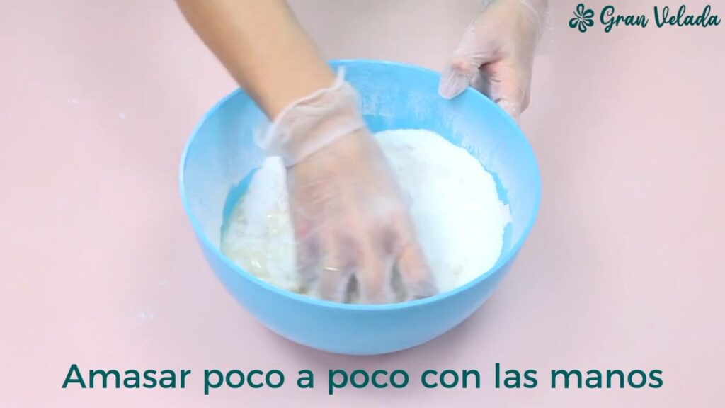 Añadir 120 g de agua de hamamelis y 3 g de esencia aromática de muñeco de galleta.Amasar poco a poco con las manos hasta conseguir una masa homogénea y sin grumos.