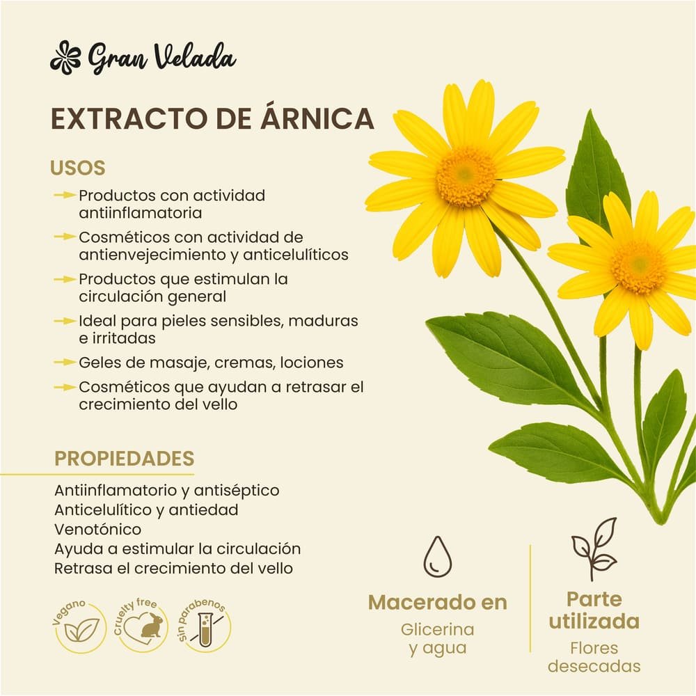 El extracto hidrosoluble de árnica es un ingrediente muy valorado en cosmética natural por su capacidad para calmar la piel, mejorar la circulación periférica y favorecer la recuperación cutánea. Se utiliza especialmente en productos para después del sol, cosméticos para piernas fatigadas, y fórmulas anti-edad con acción protectora.