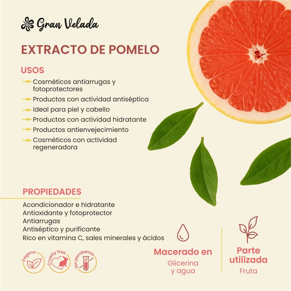En Gran Velada puedes comprar extracto de pomelo, un macerado de estos frutos en la misma cantidad de agua glicerina y agua. Se trata de un extracto hidrosoluble, de origen vegetal, que no contiene parabenos y que resulta ideal para enriquecer los cosméticos que hagas en casa.