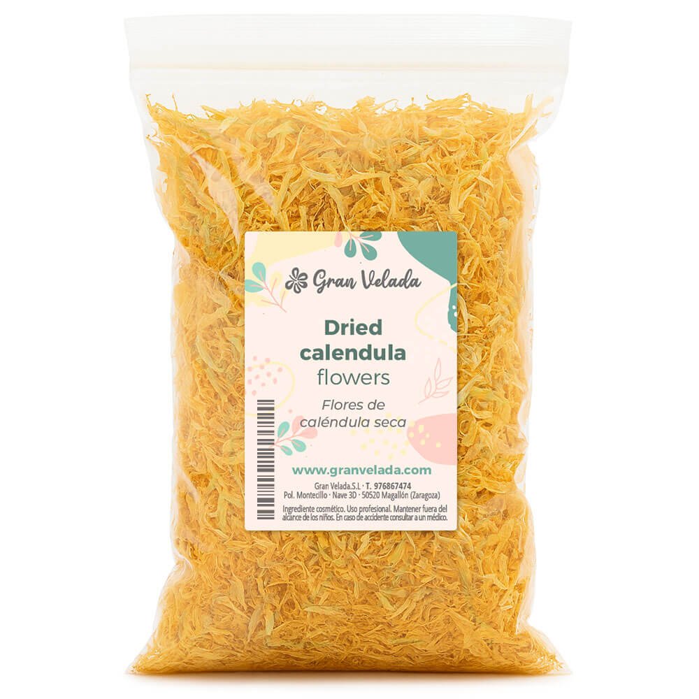 Flores de caléndula secas para cosmética, también conocidas como caléndula oficinal, maravilla, mercadela, botón de oro, flamenquilla, flamencuela, corona de rey, gauchas o marigold. Destacan por sus propiedades calmantes, antiinflamatorias, antioxidantes, cicatrizantes, antibacterianas y fungicidas. Se trata de un ingrediente ideal para hacer cremas, macerados, jabones… ya que aporta múltiples beneficios al cuidado de la piel. En Gran Velada puedes comprar flores de caléndula al por mayor y menor. Las flores de caléndula para la piel se utilizan en caso de quemaduras, acné, hongos… También están recomendadas para pieles sensibles y delicadas, así como en caso de eccemas y dermatitis. Con las flores de caléndula secas podrás elaborar cosméticos naturales para el cuidado diario de tu piel. Solo venta al cliente final.