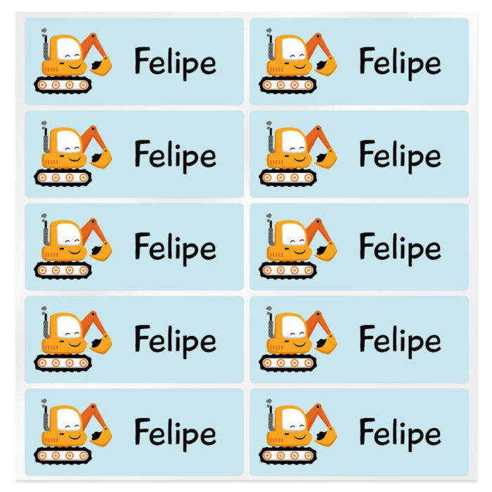 Pack de 27 pegatinas personalizadas, de 5x2cm, ideales para la vuelta al cole. Las personalizaremos con el nombre de tu hijo y así podrás pegarlas en su material escolar para que esté perfectamente identificado. Solo tienes que indicarnos el nombre y el apellido (si quieres que aparezca también este último) y las personalizaremos para ti. Son rectangulares, el fondo es de color azul y están decoradas con una divertida pala excavadora. ¡Son muy versátiles y podrás darles otros muchos usos! Las pegatinas que puedes comprar en Gran Velada destacan por su resistencia y calidad. Se adhieren perfectamente en multitud de superficies (cartón, papel, plástico, vidrio, aluminio…) y son resistentes al agua. Las pegatinas personalizadas no se pueden pagar contra reembolso.